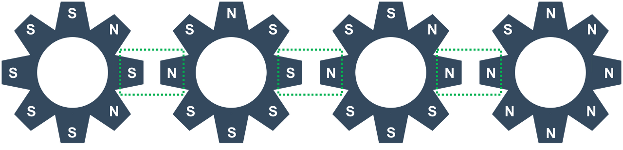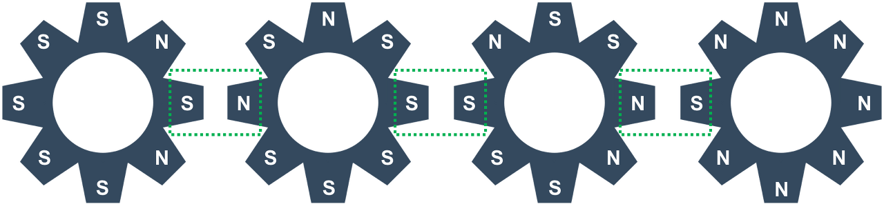 두 톱니바퀴의 맞닿은 부분은 초록색 점선으로 묶여있는 부분이다. 여기서, 3번 톱니바퀴를 반시계 방향으로 회전했다면, 4번 톱니바퀴는 시계 방향으로 회전하게 된다. 2번 톱니바퀴는 맞닿은 부분이 S극으로 서로 같기 때문에, 회전하지 않게 되고, 1번 톱니바퀴는 2번이 회전하지 않았기 때문에, 회전하지 않게 된다. 따라서, 아래 그림과 같은 모양을 만들게 된다.