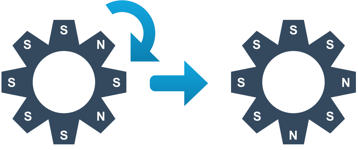 위와 같은 상태에서 1번 톱니바퀴를 시계 방향으로 회전시키면, 2번 톱니바퀴가 반시계 방향으로 회전하게 되고, 2번이 회전하기 때문에, 3번도 동시에 시계 방향으로 회전하게 된다. 4번은 3번이 회전하지만, 맞닿은 극이 같기 때문에 회전하지 않는다. 따라서, 아래와 같은 상태가 된다.