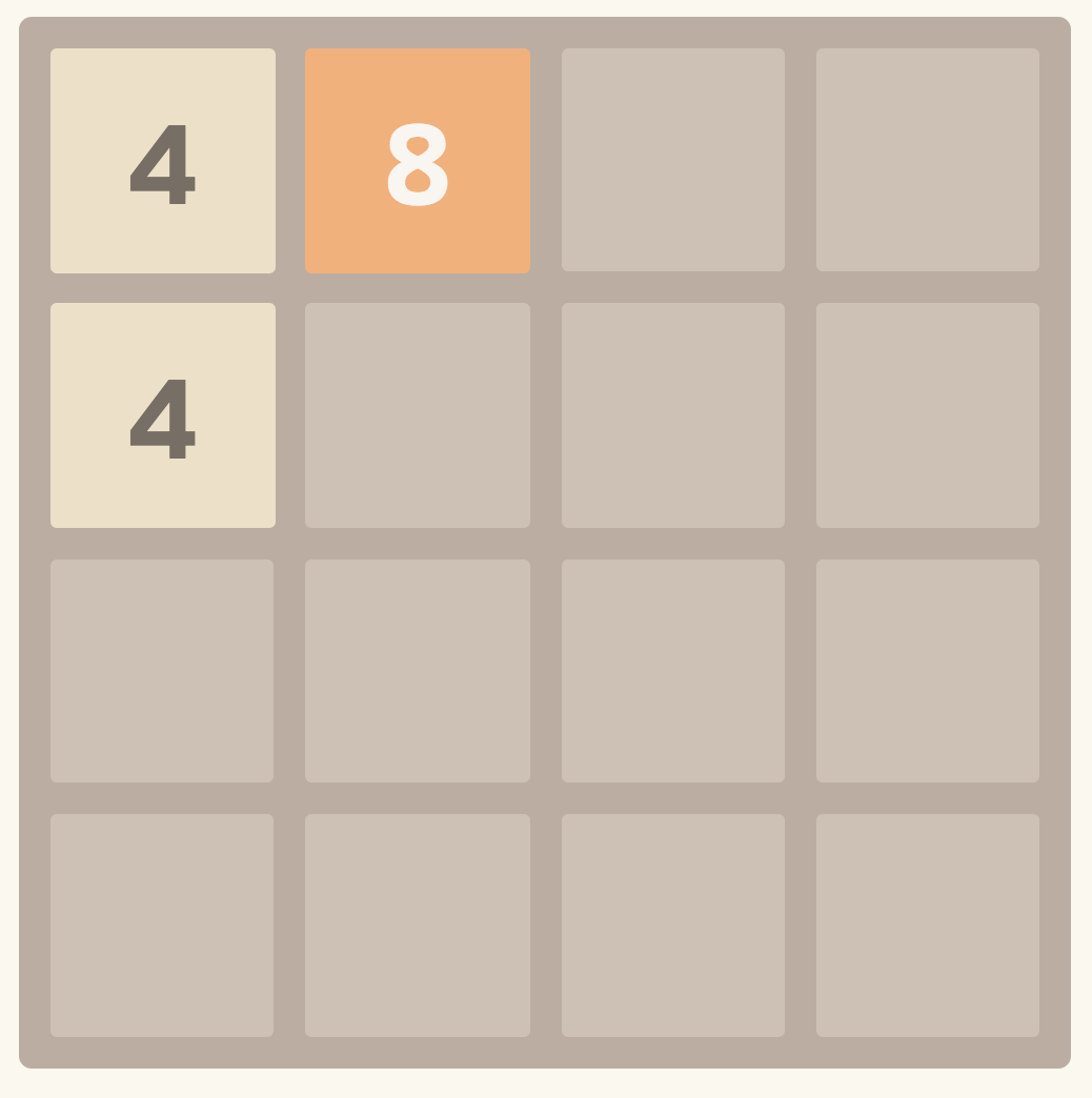 <그림 8>의 상태에서 왼쪽으로 블록을 옮기면 어떻게 될까? 2가 충돌하기 때문에, 4로 합쳐지게 되고 <그림 9>의 상태가 된다.