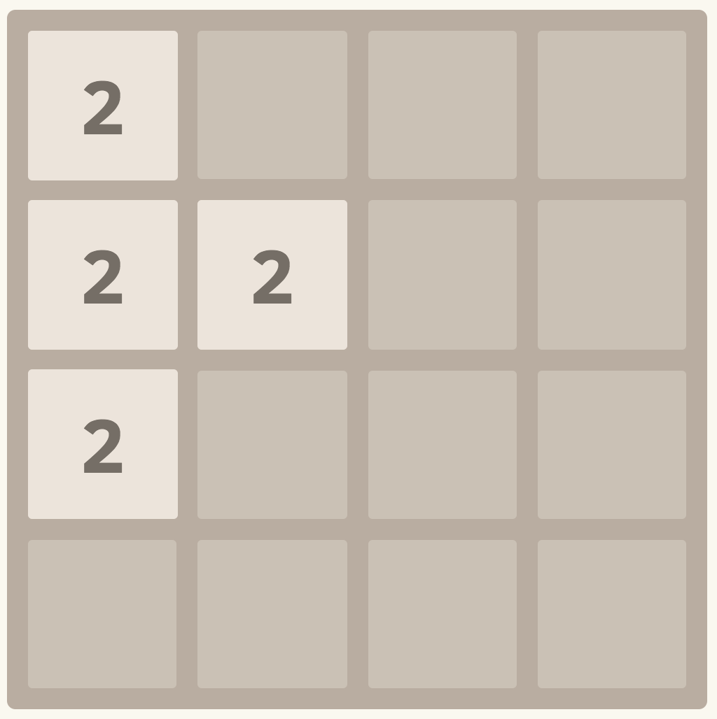 마지막으로, 똑같은 수가 세 개가 있는 경우에는 이동하려고 하는 쪽의 칸이 먼저 합쳐진다. 예를 들어, 위로 이동시키는 경우에는 위쪽에 있는 블록이 먼저 합쳐지게 된다. <그림 14>의 경우에 위로 이동하면 <그림 15>를 만든다.
